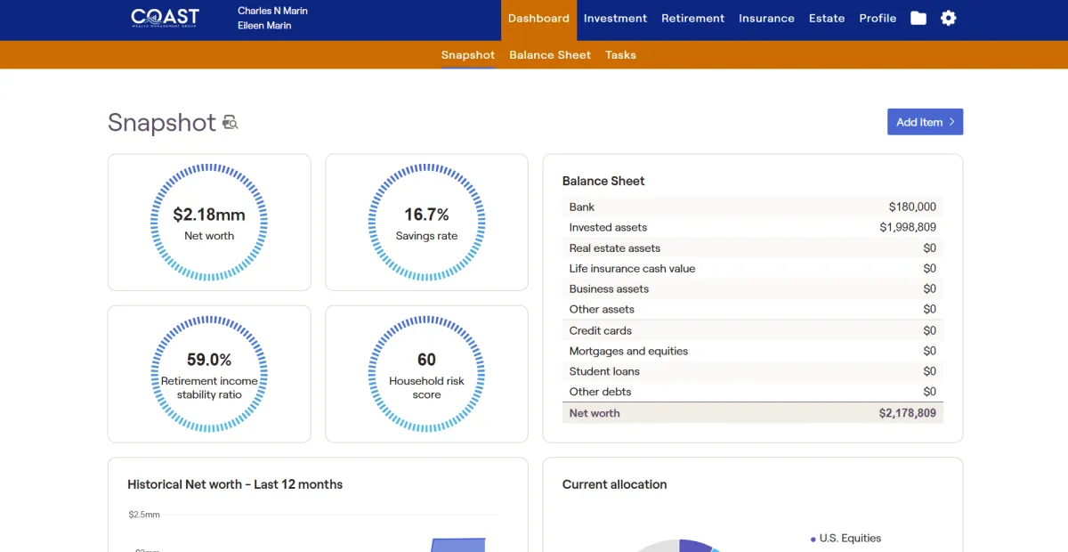 Login to Coast Wealth's private client portal to see your accounts all in one place and access financial planning tools, document vault, and more.
